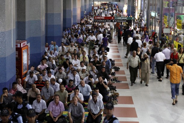 Worshippers attend Friday prayers as commuters walk past at the Kizilay Station of the Ankara metro network in Ankara July 31, 2009. REUTERS/Umit Bektas