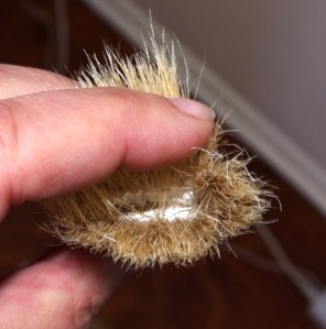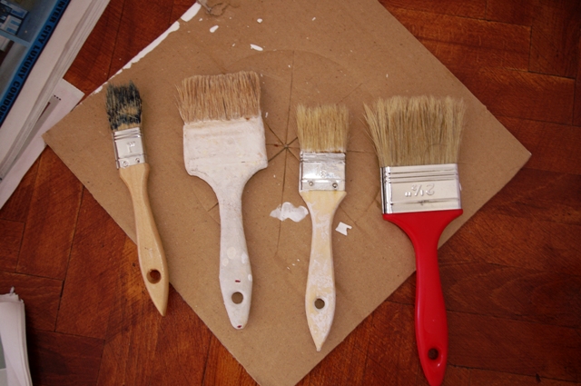 We already had paint brushes at home. So I shook up my little plastic container of water-based paint and dipped right in. Ugh. Two problems. First, these were not the Purdy brushes that brother Billy had introduced to me. These sucked. They had a split in the middle of the brush, above the bristles, that caused the brush to hold onto way to much paint.