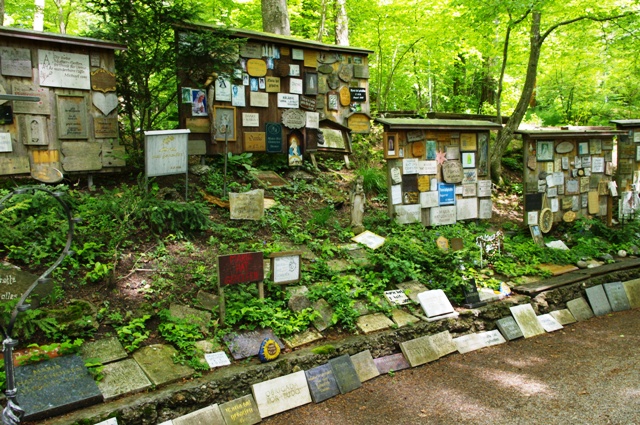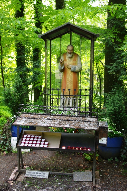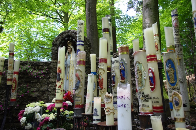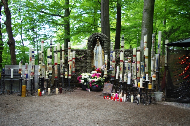 Along the walk are the Stations of the Cross.  An altar is in the middle where mass is said on special occasions and holidays.  Behind the altar is a grotto, where worshippers come to give hommage to Mary.  There are over 1000 spots for votive candles – lit for special intentions.  Visitors often bring tall beautiful candles to thank Mary for her help.  Around the grotto are plaques, photos, and handmade items which are also left in thanks for Mary’s assistance.   They come from around the world.
