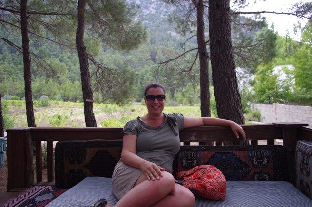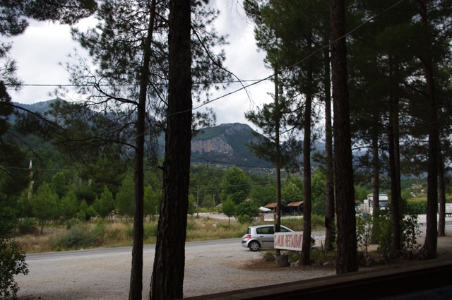 The return ride was just as beautiful.  We stopped to purchase locally-made honey.  We also stopped to enjoy a traditional Turkish treat.  Gözleme is a savoury traditional Turkish hand made and hand rolled pastry.  This one was stuffed with feta and parsley.  It is cooked on a round griddle.  We enjoyed it with tea, sitting out under the pines in a wooden box made specifically for this type of thing, and just before the rains came.