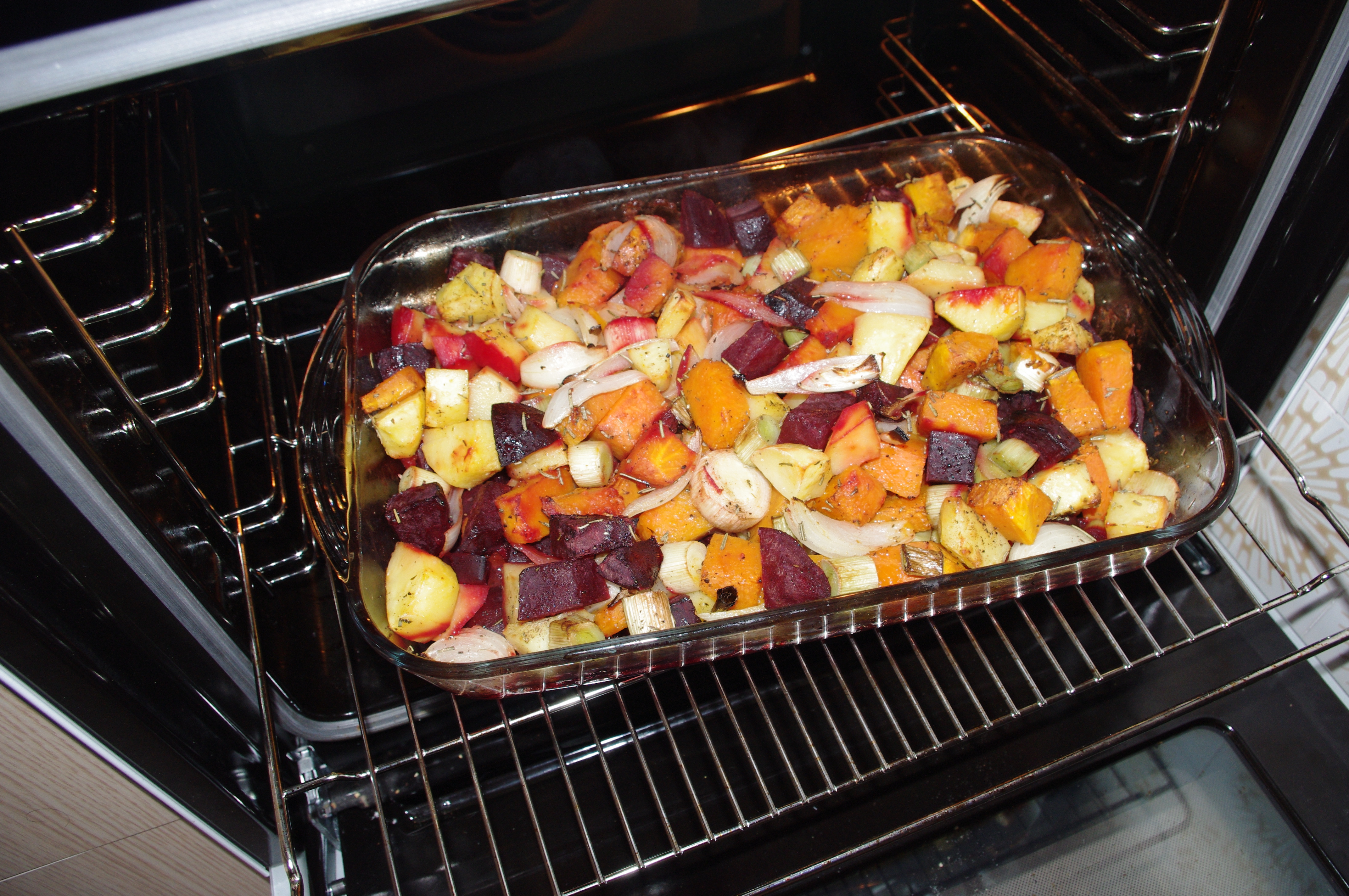 Roasted Autumn medley. That’s already in the oven. Hopefully I will have a free oven for a few minutes to reheat it tomorrow. White potatoes, leeks, beets, onion, and pumpkin in olive oil, rosemary and thyme. Oh, how I miss red potatoes, sweet onions, butternut squash!!