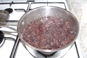 Cranberry sauce. Not sold in a can here. Actually, I haven’t been able to find them at all. But I found a nice dried berry that might be cranberry. It’s on the stove now. Mandarin orange, apple, cinnamon and nutmeg. Smells good.