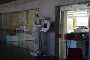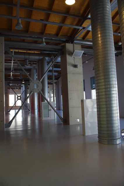 The Main Exhibition Hall is enclosed with large glass windows. The art is tastefully displayed with plenty of room to meander and ruminate. Tall metal enclosures that surround original poles (hiding whatever they need to hide) and the exposed beam ceilings lend a fresh contemporary look to the old-time factory.  You should visit often as the exhibitions are frequently changing.