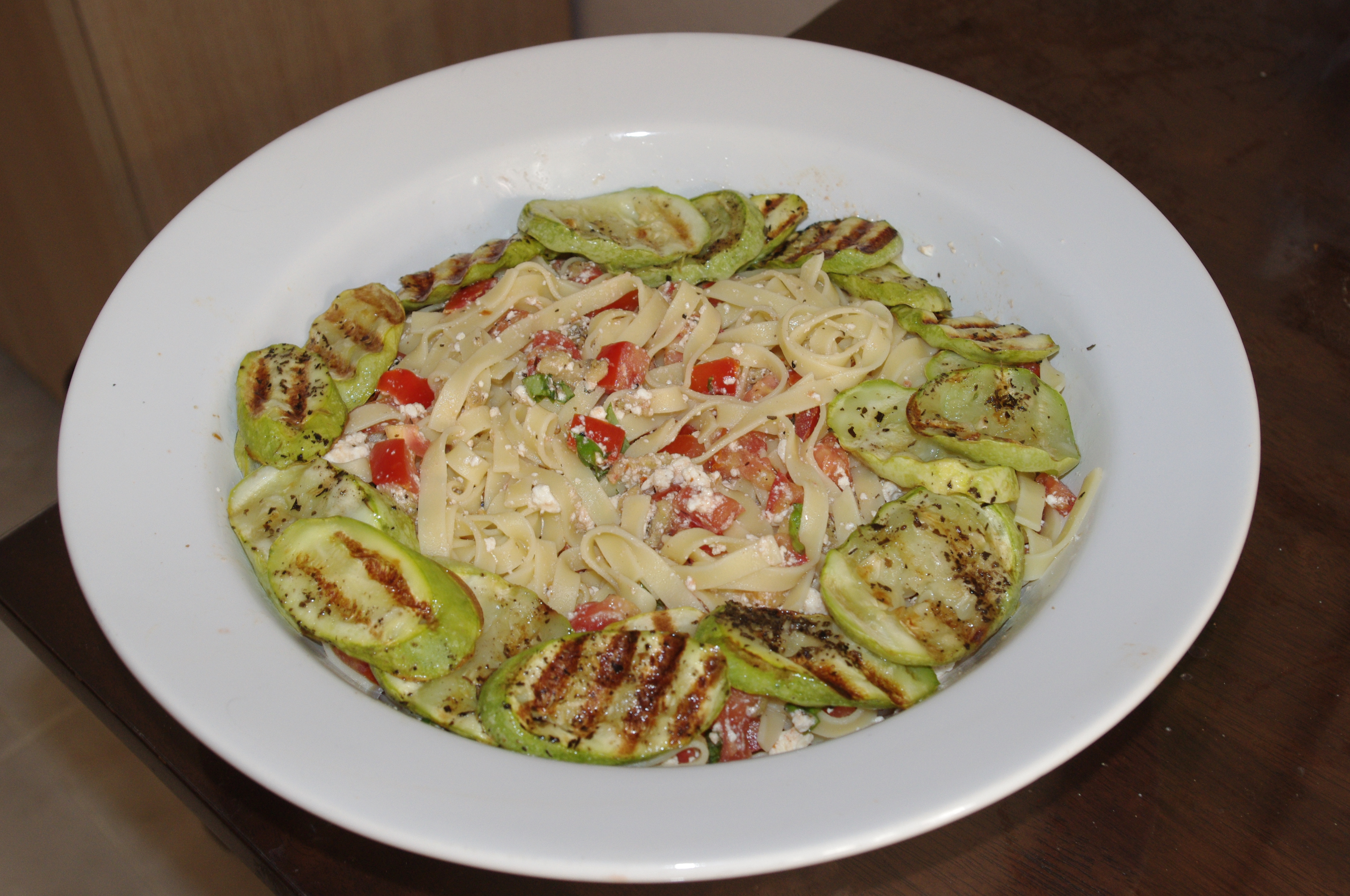 When the pasta is finished (al dente), drain and rinse it and add it to the bowl. Toss. Decorate with the grilled zucchini. Serve with garlic bread or a nicely toasted herb bread.