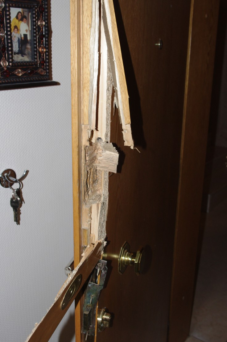 The neighbor rented an apartment that had the worst door in the building.  It was literally made of particle board as was the surrounding frame.  She had complained many times to her landlord to no avail.  Asshole!