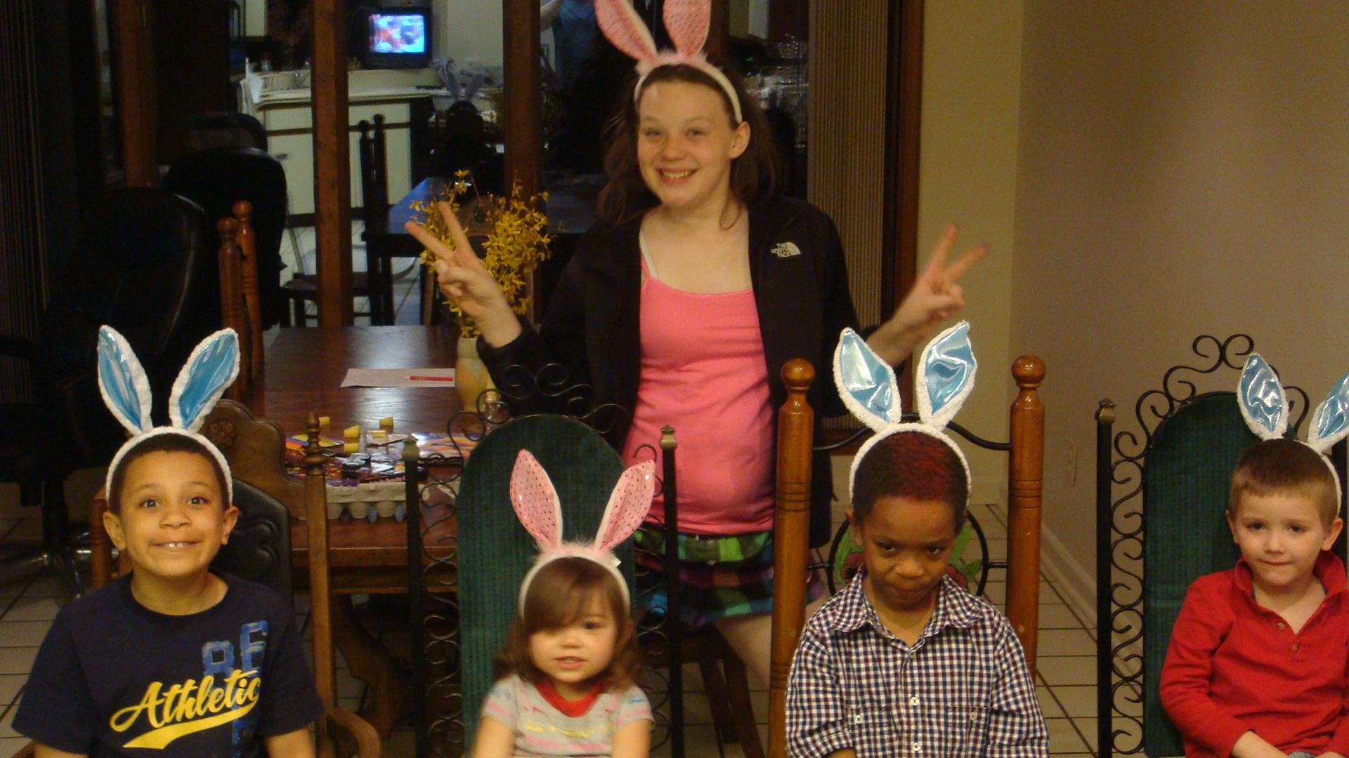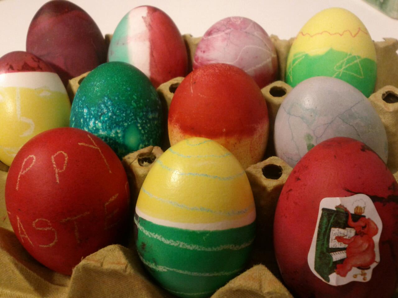 Next, I found photos of my family preparing for the big day. Apparently, my sister’s four children and her grandchildren came together yesterday to deocrate eggs. Below is a shot of her grandkids. I guess the three babies were napping and missed the photo op.