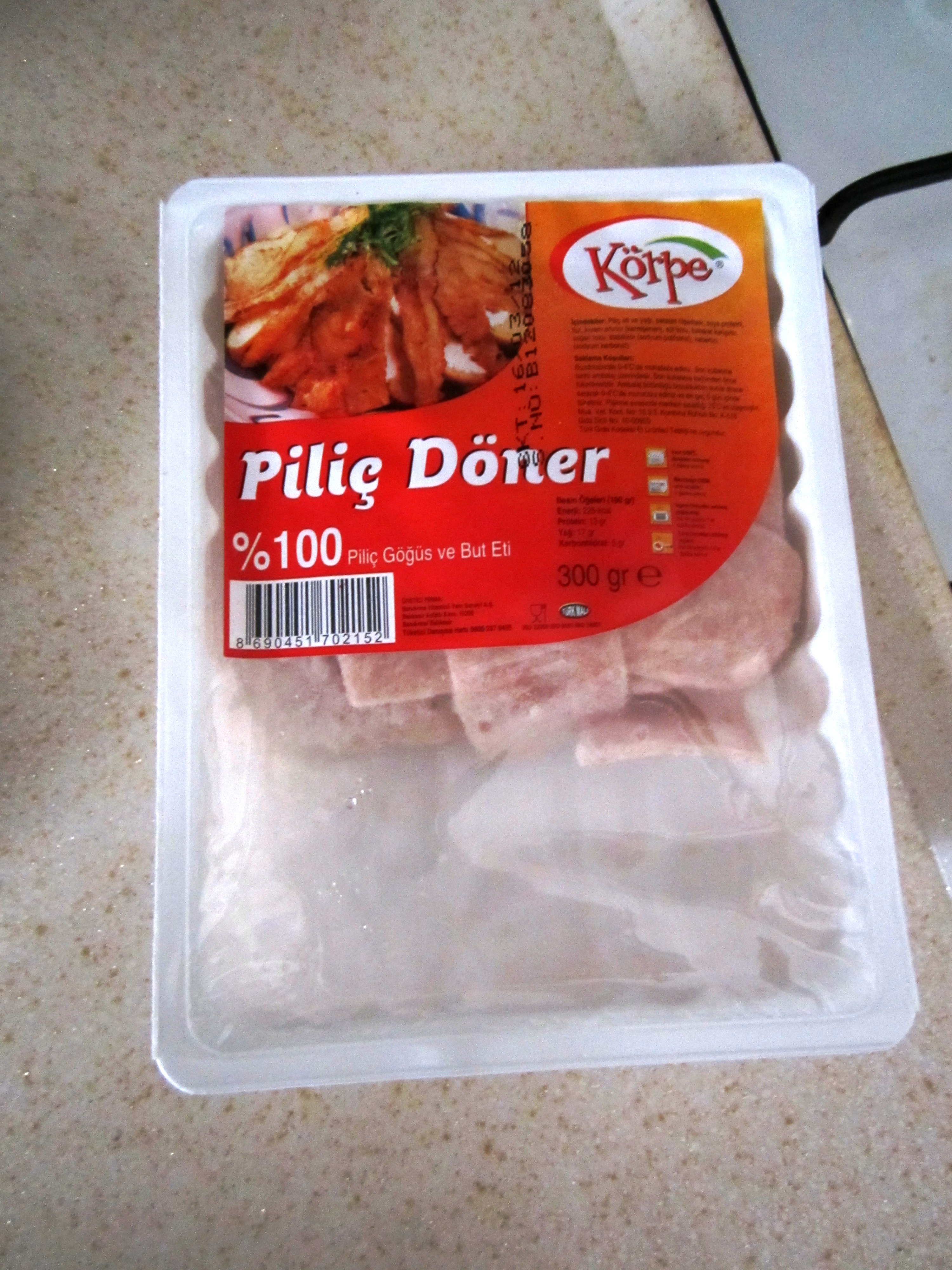 In the markets, one can easily find frozen Döner, made of chicken or beef. We buy the chicken version and always have it on hand in the freezer.  For those of you trying to save a few pennies, go to Bim.  It’s less than 4TL for 300 grams and is perfect for the following recipes.