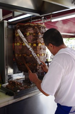 In the States, (you may have noticed that I have taken to calling it the “States” instead of “America.”  That is for the benefit of my “North American” friend from Canada.) we are very familiar with the Greek Gyro – a sandwich made on pita bread with what we hope is thinly sliced lamb.  Although, I am told by a Greek friend who owns a restaurant in Philly that it is usually pork.  Turkey proudly boasts a similar meat called “Döner.”  Practically identical to the Gyro meat, it is heaps of meat piled on a vertical spit and grilled.  The meat is thinly shaved from the outer sides as it cooks.  It can be served on pita, in a wrap, or on a plate with yummy toppings.  While it is normally made of lamb, it can also be found made of chicken or beef.