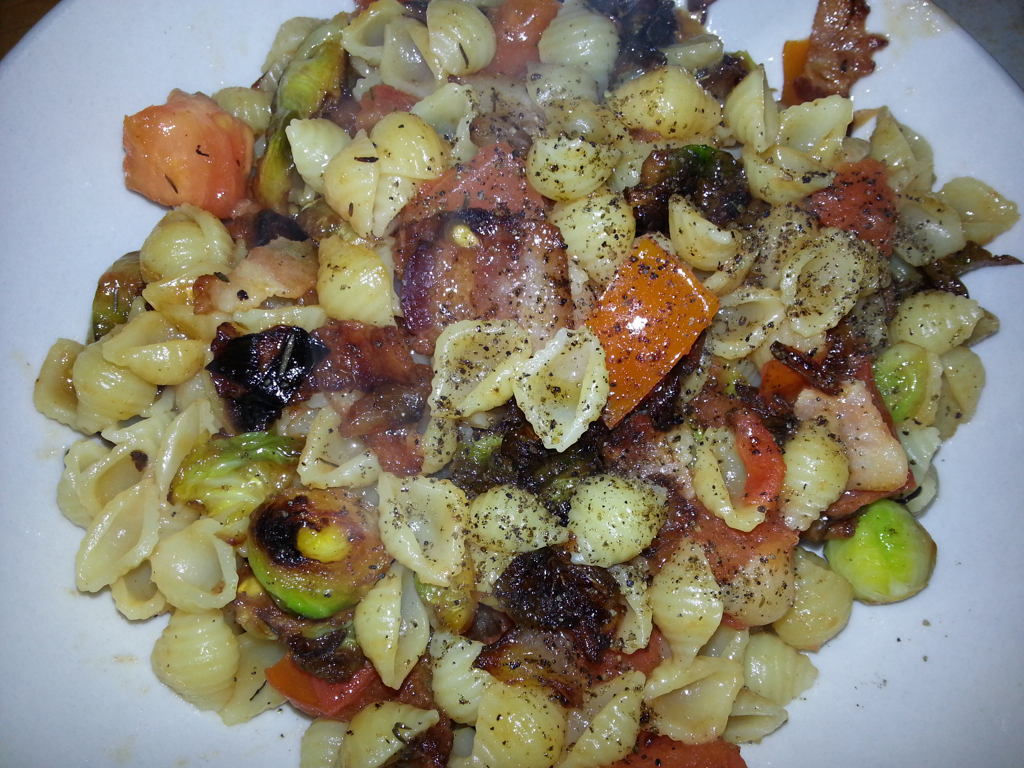 Orecchiette with sauteed (in virgin olive oil) brussel sprouts, onions, tomatoes, garlic, thyme, black pepper and bacon. Topped with Parmesan/Reggiano cheese!
