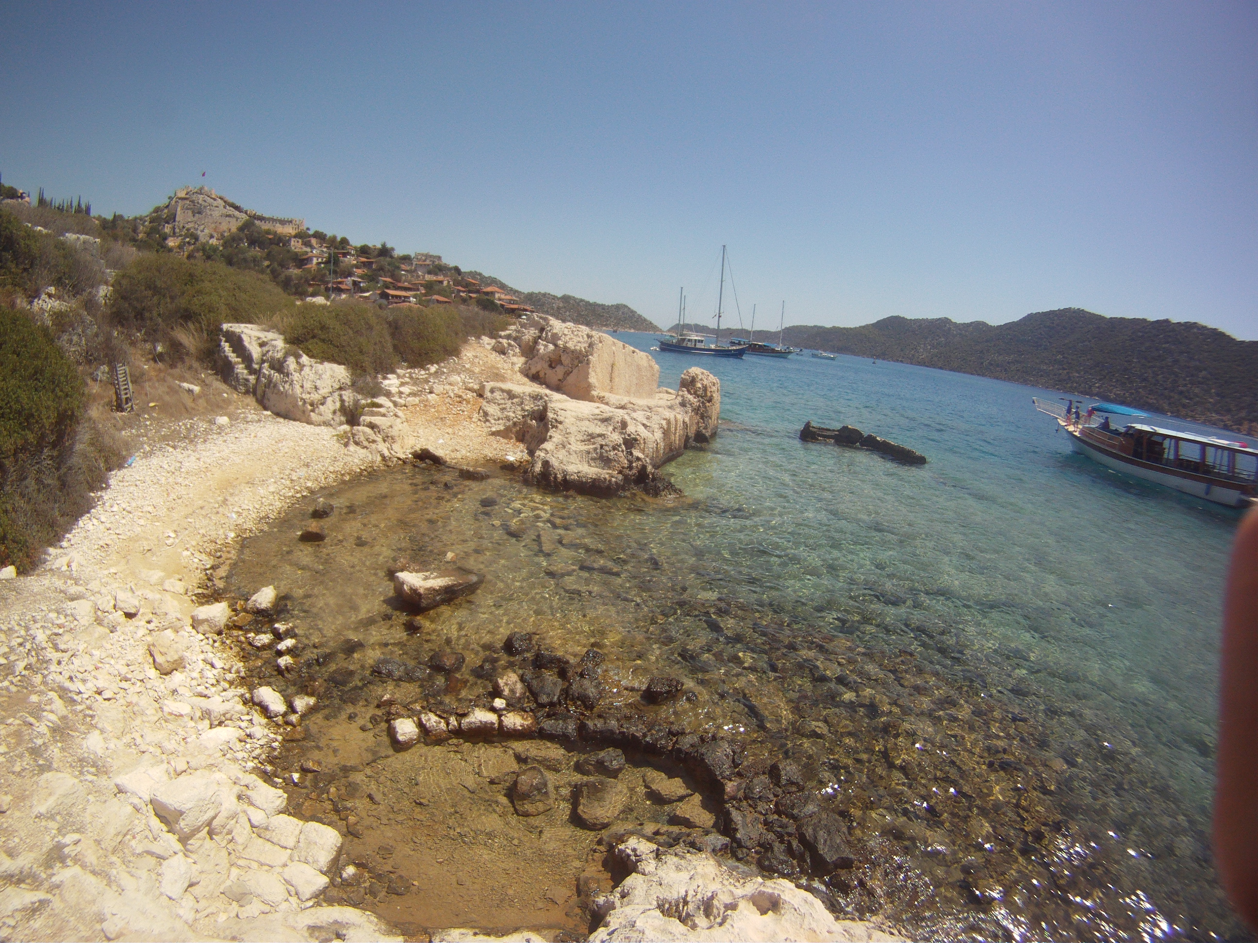 Alkan and his crew set up each kayak to fit each adventurer, and then we were off. The rowing was not too strenuous. It was a very enjoyable day with a nice breeze breaking the blazing sun. It really didn’t feel too hot. We paddled to Kekova Island and then to Tersane Bay. We received more information on the Sunken City and paddled over it. We crossed over to Simena (kale Koy), the ancient village with the ruins of a castle that gives it its name. There we had time for lunch and a swim.