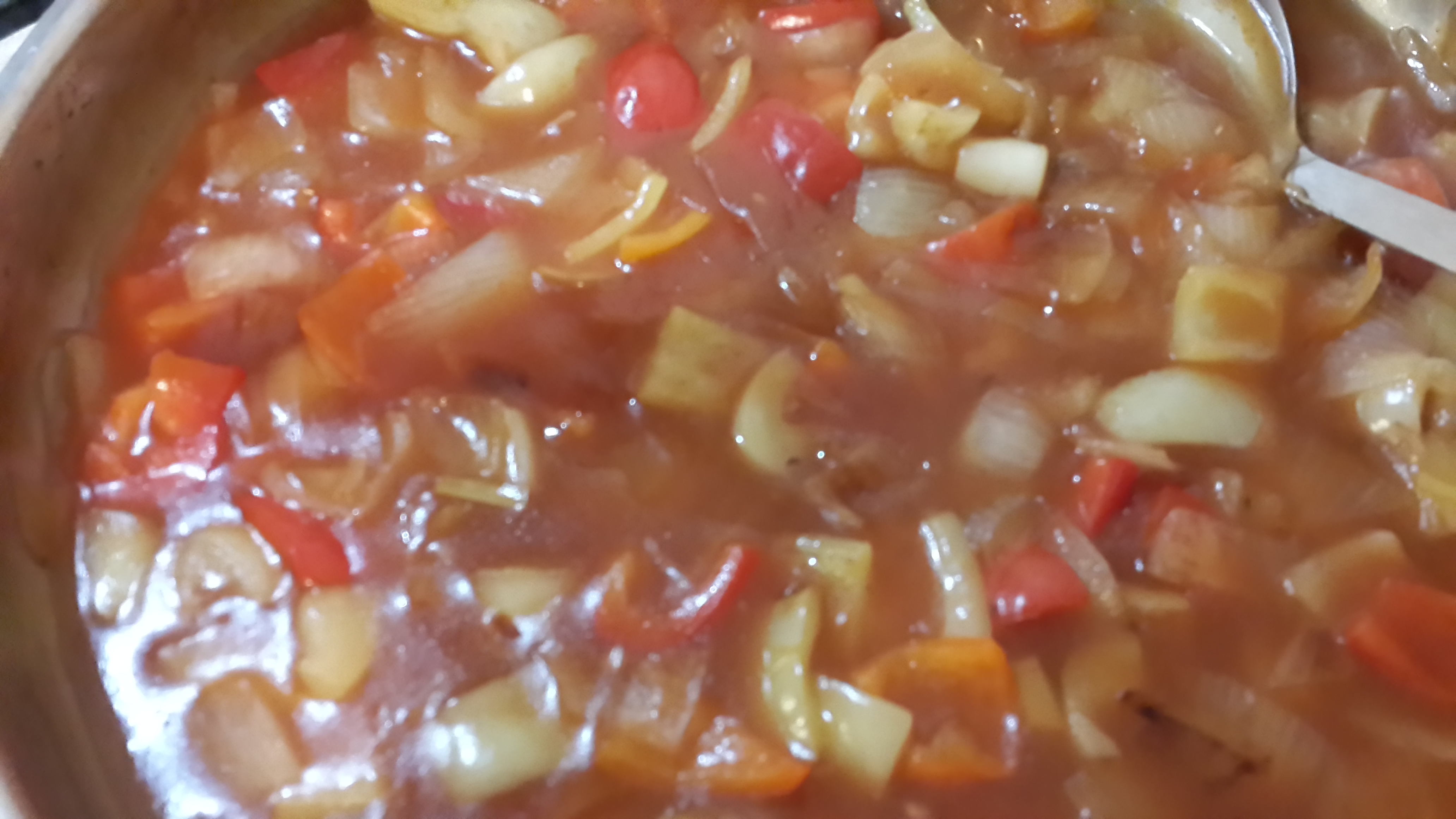 • You will see in the video that the sauce does not contain peppers, onions, and pineapple as we know it. According to the video, that is “pineapple” chicken.  I went ahead and sauteed onions and peppers (and once I added carrots too) in olive oil before adding the sauce to the pan.  Saute just until slightly wilted – they should be more “al dente.”  Add the sauce base.  Then add the thickener.  I used a lot of vegetables because we like it that way.  You can find canned pineapple in most markets in Turkey.  And of course, fresh pineapple when in season.