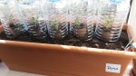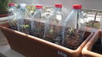 Finally, I cut 1 liter plastic water bottles in half. I set them around each tube to create a greenhouse effect. When watering, I remove the caps of the tops halves of the bottles and lightly water the plant through the holes. For the bottom halves, I do have to lift each bottle to water. But it’s not so hard.