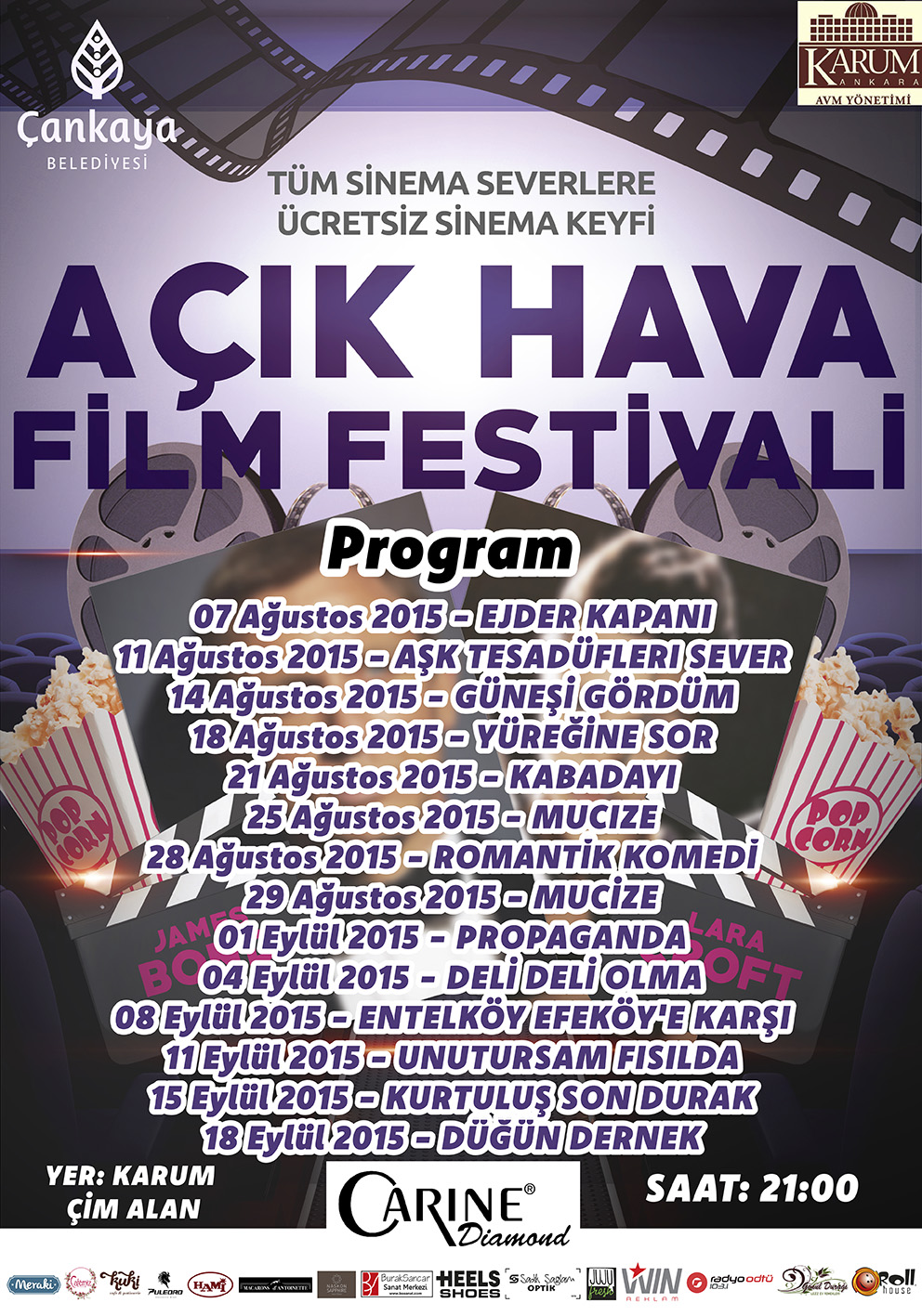 Çankaya Belediyesi will be sponsoring an open-air movie festival at Karum AVM. The films will be held Friday and Tuesday evenings at 9pm outside of the mall from August 7th through September 18th. The films are Turkish and probably do not have English subtitles, but I am sure it will be a nice way to spend the evenings! A list of the films is below: