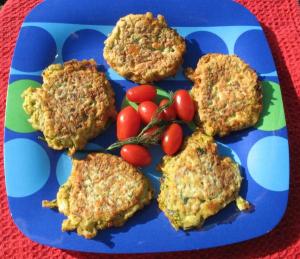 In a large sauté pan over medium-high heat, pour in oil to a depth of ¼ inch; when the oil is hot, drop the batter by heaping tablespoonfuls into the pan (or form into small patties), allow space in between fritters; fry for 2 minutes on the fist side, then turn to brown on the second side for about 3 minutes; using a slotted spatula transfer to paper towels or newspaper to drain; repeat with remaining batter.