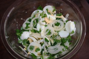 Place onions and parsley in a glass or plastic bowl. Coarsely chop or thinly slice eggs. Place in same bowl. Add lemon, olive oil, sumac and pepper. I don’t use salt but you can if you want to. Lightly toss so as not to smash the eggs.
